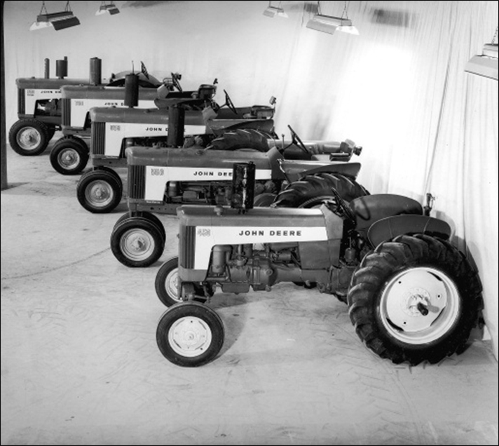 Here’s five models of the lineup. Absent is the “350”. There had been some controversy as to whether or not the “M”-powered tractor would be continued in production, as had been the economical “320”. The John Deere Dubuque Tractor Works was a small fraction of the size of the Waterloo factory, and had proportionately fewer resources. Already burdened with eight variations planned for the “450”; the upcoming Diesel-powered tractor(would it be the “455”?); and engineering, development, testing, and tooling up for the NewGeneration 1010 and 2010; the “350” (ultimately the“330”) was reportedly “on the bubble.”